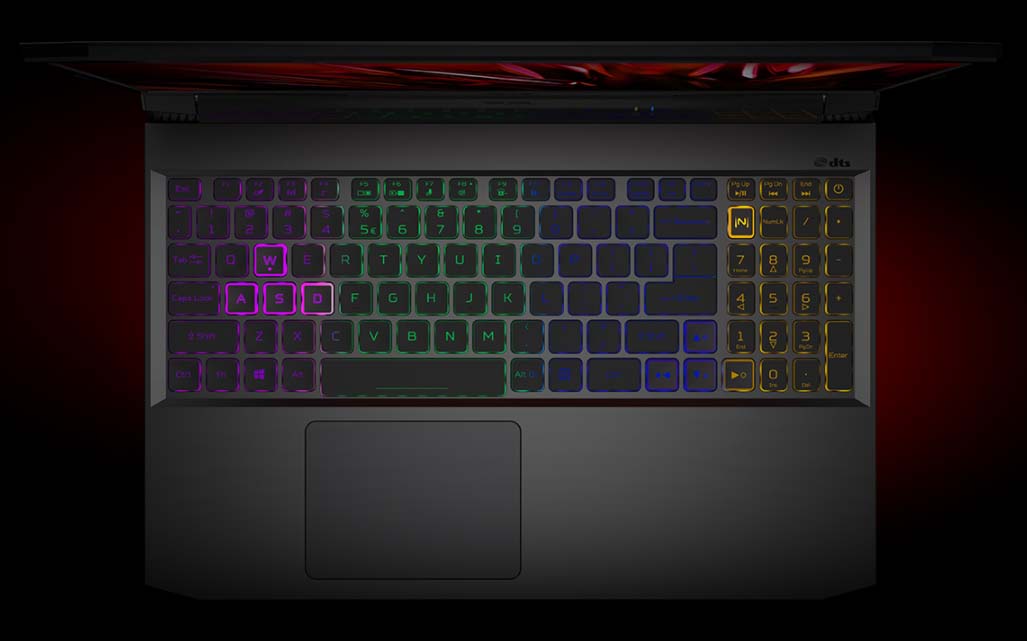 Với bàn phím RGB 4 vùng tùy chỉnh và các phím WASD cùng phím mũi tên cũng được làm nổi bật để dễ dàng hiển thị. Acer Nitro 5 dễ dàng thỏa sức sáng tạo để thể hiện phong cách của mình qua phần mềm NitroSense.
