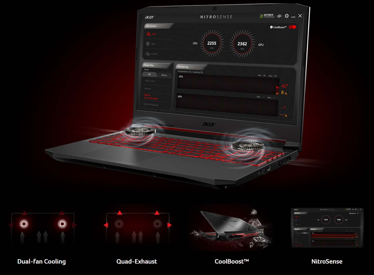 Công nghệ Acer CoolBoost với quạt kép và 4 cổng thoát khí, giúp tăng tốc độ quạt lên 10% và làm mát CPU / GPU lên 9% ở chế độ tự động. Ngoài ra bạn có thể theo dõi và quản lý hệ thống bao gồm nhiệt độ, tốc độ quạt và hơn thế nữa thông qua NitroSense.