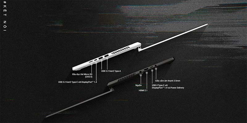 Laptop Gaming Asus ROG Zephyrus G14 GA402NJ-L4056W hoạt động đa nhiệm hiệu quả hơn qua cổng USB-C hỗ trợ DisplayPort, xem phim 4K UHD trên màn hình lớn hoặc dễ dàng kết nối máy chiếu với HDMI 2.1. Kết nối các thiết bị ngoại vi để bạn thoải mái sáng tạo.