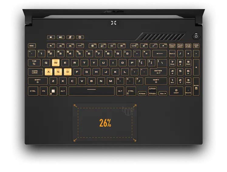 Laptop Asus TUF Gaming F15 FX507ZC4 trang bị bàn phím chơi game với đèn nền RGB thống nhất cùng touchpad lớn hơn 26% mang lại độ chính xác tuyệt vời trong thời gian dài.