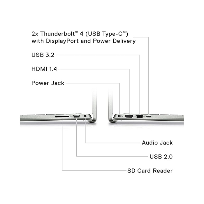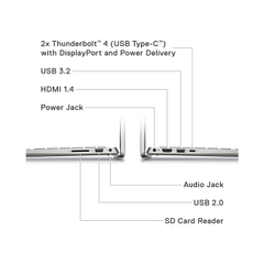 Dell Inspiron 14 Plus 7420 có đầy đủ cổng kết nối: USB 3.2, Thunderbolt 4.0, HDMI 2.0, jack tai nghe, SD card và cổng sạc. Pin 64 WHr cho thời gian sử dụng 8-9 tiếng, cho bạn thoải mái sử dụng mà không lo ngắt hết pin.