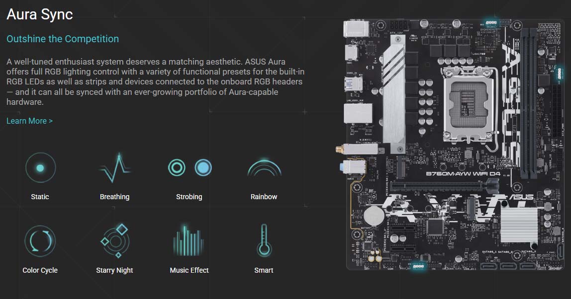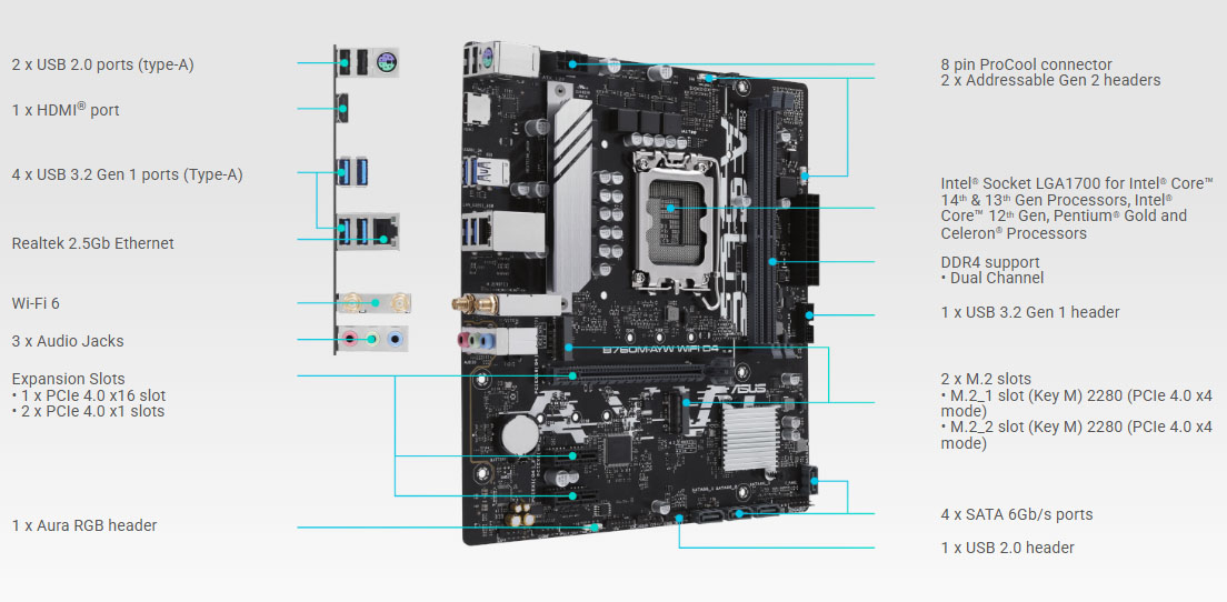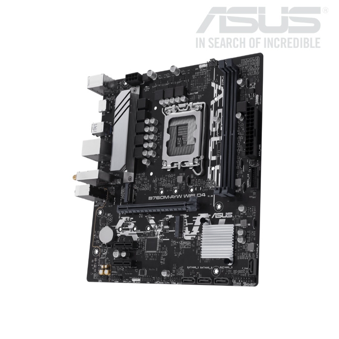 Mainboard Asus B760M-AYW sử dụng socket LGA1700, tương thích với các vi xử lý Intel Core thế hệ thứ 12, 13 và 14. Điều này đảm bảo rằng hệ thống của bạn luôn sẵn sàng cho các nâng cấp CPU trong tương lai, từ đó duy trì hiệu suất ổn định và mạnh mẽ.