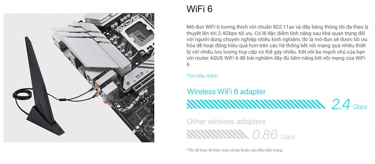 - WiFi 6: Mô-đun WiFi 6 tương thích với chuẩn 802.11ax và đẩy băng thông tối đa theo lý thuyết lên tới 2.4Gbps tối ưu. Có lẽ đặc điểm tính năng sau khá quan trọng đối với người dùng chuyên nghiệp nhiều kinh nghiệm, đó là mô-đun sẽ được tối ưu hóa để hoạt động hiệu quả hơn trên các hệ thống kết nối mạng quá nhiều thiết bị với nhiều lưu lượng truy cập có thể gây nhiễu. Kết nối bo mạch chủ của bạn với router ASUS WiFi 6 để trải nghiệm đầy đủ tiềm năng kết nối mạng của WiFi 6.