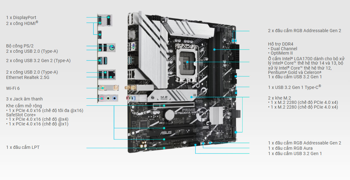 - Khe cắm PCIe 4.0: Bo mạch chủ PRIME B760 được thiết kế dành riêng cho CPU Intel® thế hệ 14, 13 và 12, đồng thời cung cấp kết nối PCIe 4.0 cho các GPU mới nhất.