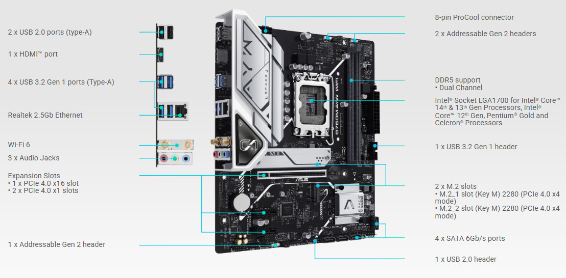 Bo mạch chủ dòng ASUS B760 được thiết kế chuyên nghiệp để phát huy tối đa tiềm năng của Bộ xử lý Intel® Core™ thế hệ thứ 13. Tự hào với thiết kế nguồn mạnh mẽ, giải pháp làm mát toàn diện và các tùy chọn điều chỉnh thông minh, B760M-AYW WIFI cung cấp cho người dùng và người xây dựng PC DIY một loạt các tối ưu hóa hiệu suất thông qua các tính năng phần mềm và chương trình cơ sở trực quan.