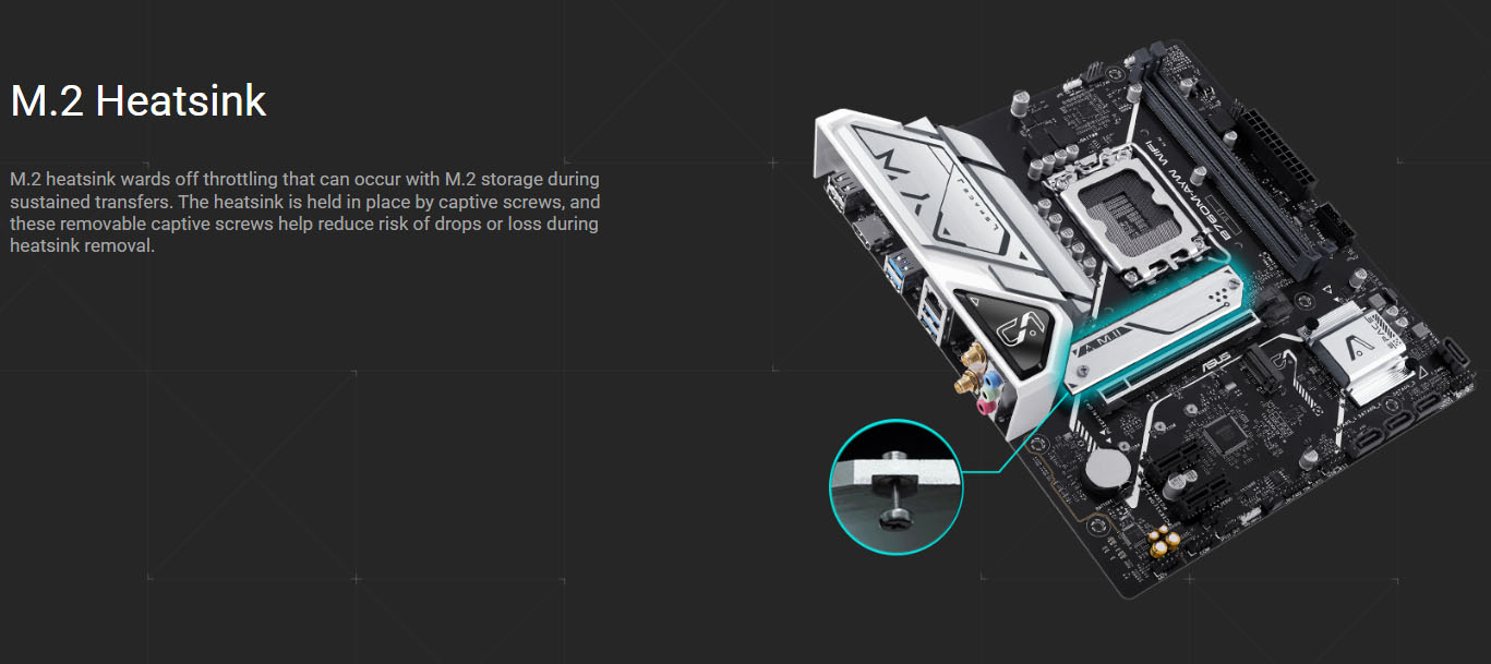 Tản nhiệt M.2: tránh hiện tượng nghẽn cổ chai có thể xảy ra với bộ lưu trữ M.2 trong quá trình truyền liên tục. Tản nhiệt được giữ cố định bằng các vít cố định và các vít cố định có thể tháo rời này giúp giảm nguy cơ bị rơi hoặc mất mát trong quá trình tháo tản nhiệt.