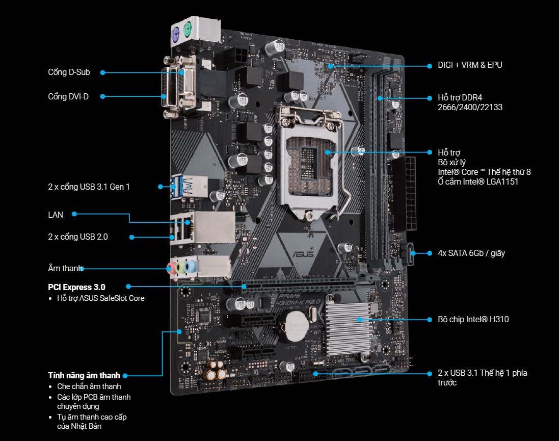 Mainboard ASUS PRIME H310M-K R2.0 cung cấp nền tảng vững chắc cần thiết cho nền tẳng xây dựng cấu hình máy tính của người dùng, hỗ trợ bộ vi xử lý Intel ® Core ™ Thế hệ thứ 8, với thiết kế và kỹ thuật thiết yếu, để người dùng được hưởng lợi từ các công nghệ hàng đầu trong ngành, bao gồm điều chỉnh hệ thống tự động, điều khiển làm mát toàn diện và âm thanh có chiều sâu.