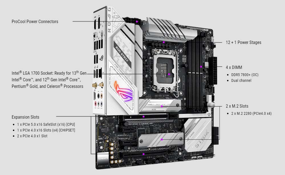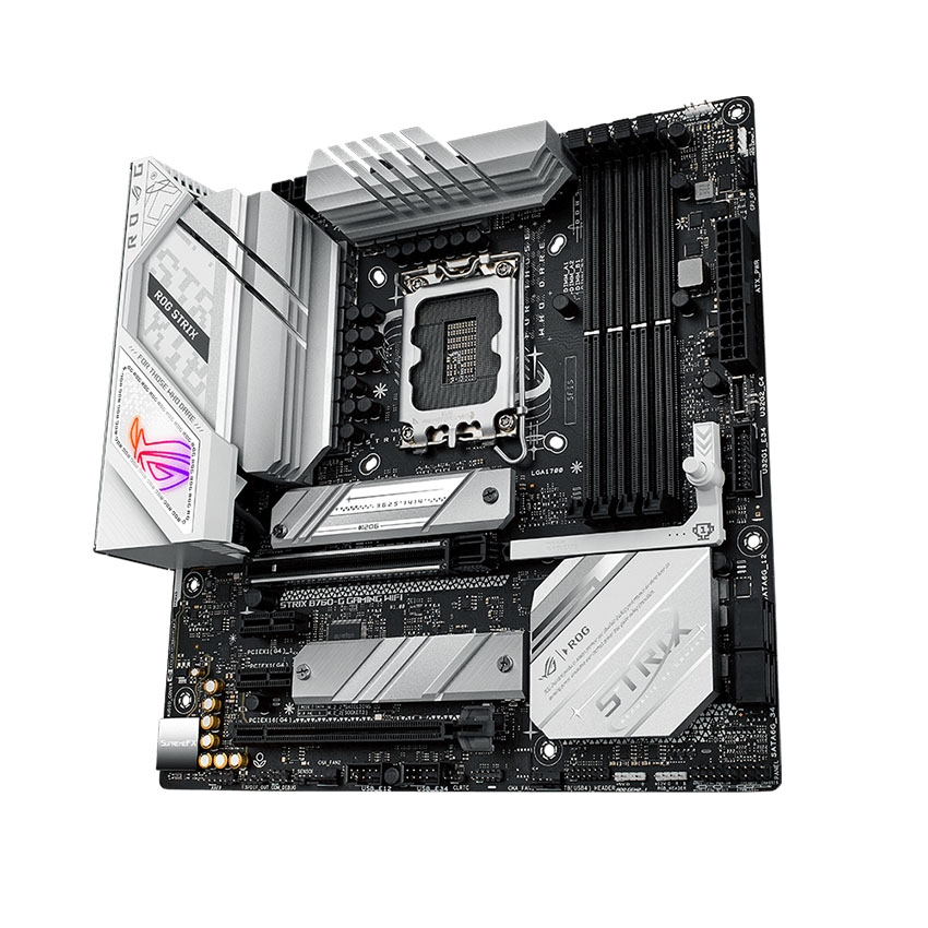 Asus ROG STRIX B760-G GAMING WIFI DDR5 sử dụng socket LGA1700 hỗ trợ các CPU Intel thế hệ 12, 13 và sắp tới sẽ là cả các CPU gen 14. 4 Khe RAM DDR5 hỗ trợ dung lượng bộ nhớ trong lên tới 192GB với tốc độ 7800+MT/s. 2 khe M.2 PCIe 4.0 nhằm đạt tới tốc độ truyền dữ liệu tối đa. "Bộ giáp" tản được trang bị diện tích lớn giúp cho nhiệt độ của bo mạch chủ luôn mát mẻ trong quá trình cấp điện cho các linh kiện khác. 4 cổng cắm fan PWM/DC cùng cổng cắm AIO pump hỗ trợ lắp đặt các loại tản nhiệt nước và quạt tản nhiệt.