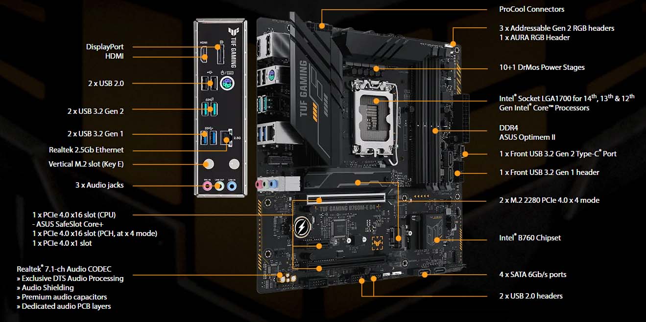 Asus TUF Gaming B760M-E DDR4 còn có khả năng bảo vệ các linh kiện. SafeSlot Core+ là vỏ bọc kim loại gia cố được thêm vào khe cắm PCIe để giữ cho thẻ được lắp đặt chắc chắn. Ngoài ra, vỏ bọc ASUS SafeDIMM được thêm vào để hỗ trợ và bảo vệ các mô-đun bộ nhớ trên một số bo mạch chủ ASUS, cho phép bạn lắp ráp một cách nhanh chóng, chính xác