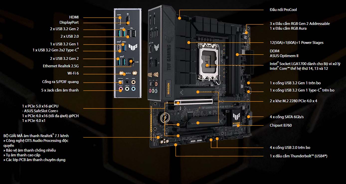TUF GAMING B760M-PLUS WIFI D4 khai thác tất cả sức mạnh và tiềm năng từ bộ vi xử lý Intel® mới nhất và kết hợp với các tính năng giúp dàn máy của bạn sẵn sàng chinh phục các tựa game cùng độ bền đã được kiểm nghiệm. Được thiết kế với các linh kiện có độ bền chuẩn quân sự, giải pháp truyền tải điện năng được nâng cấp và hệ thống làm mát toàn diện, bo mạch chủ này vượt xa mong đợi với hiệu năng ổn định để chơi game liên tục. Các bo mạch chủ TUF GAMING cũng đã phải trải qua quá trình kiểm tra độ bền nghiêm ngặt để đảm bảo có thể xử lý các điều kiện mà các bo mạch chủ khác có thể gặp lỗi. Nói về thiết kế, mẫu bo mạch chủ nổi bật với phần logo dập nổi cùng các tản nhiệt vát theo khối hình học, phản ánh độ tin cậy và độ ổn định vốn là đặc trưng của dòng TUF GAMING. Nền tảng này cung cấp sức mạnh và khả năng kết nối mà các ứng dụng AI PC tiên tiến yêu cầu.