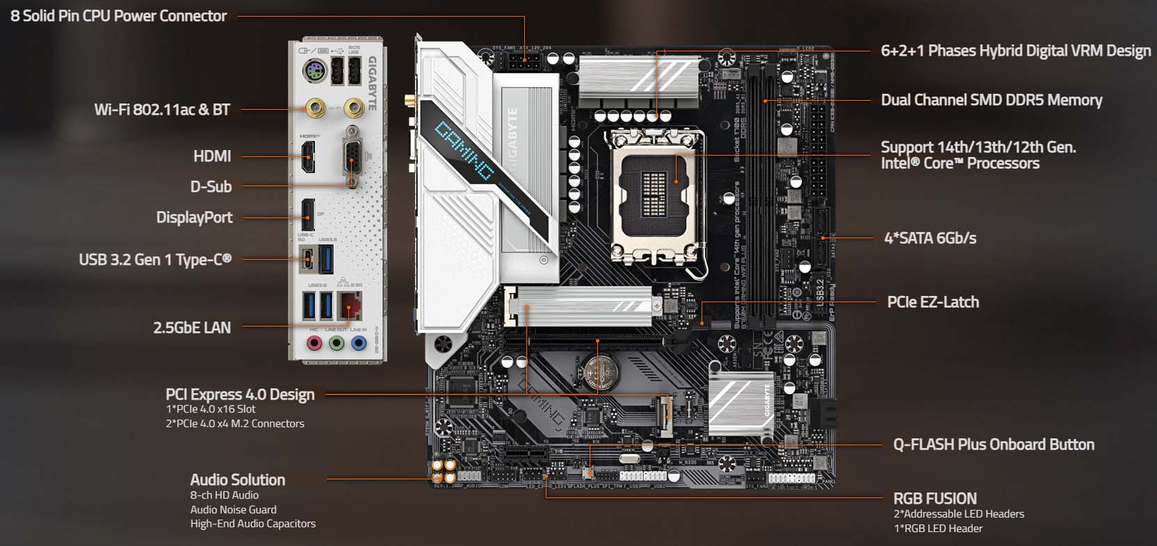 Gigabyte B760M GAMING WIFI PLUS DDR5 là một bo mạch chủ Micro-ATX được thiết kế để tối ưu hóa hiệu năng cho các game thủ và người dùng đam mê công nghệ. Với hàng loạt tính năng tiên tiến, bo mạch chủ này không chỉ mang lại hiệu suất ổn định mà còn cung cấp các tùy chọn kết nối linh hoạt và khả năng mở rộng cao cấp.