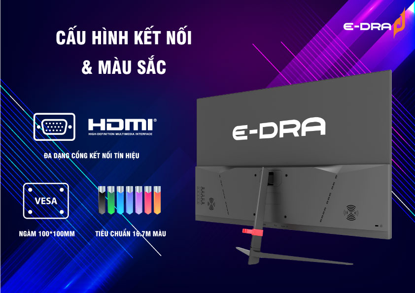 Trang bị cổng kết nối HDMI 2.0 và Displayport 1.2, E DRA - EGM27F100 dễ dàng kết nối và nhận tín hiệu từ nhiều thiết bị khác nhau. Màn hình cũng hỗ trợ ngàm vesa 100x100 tương thích cho nhiều loại arm màn hình và giá treo thông dụng trên thị trường.