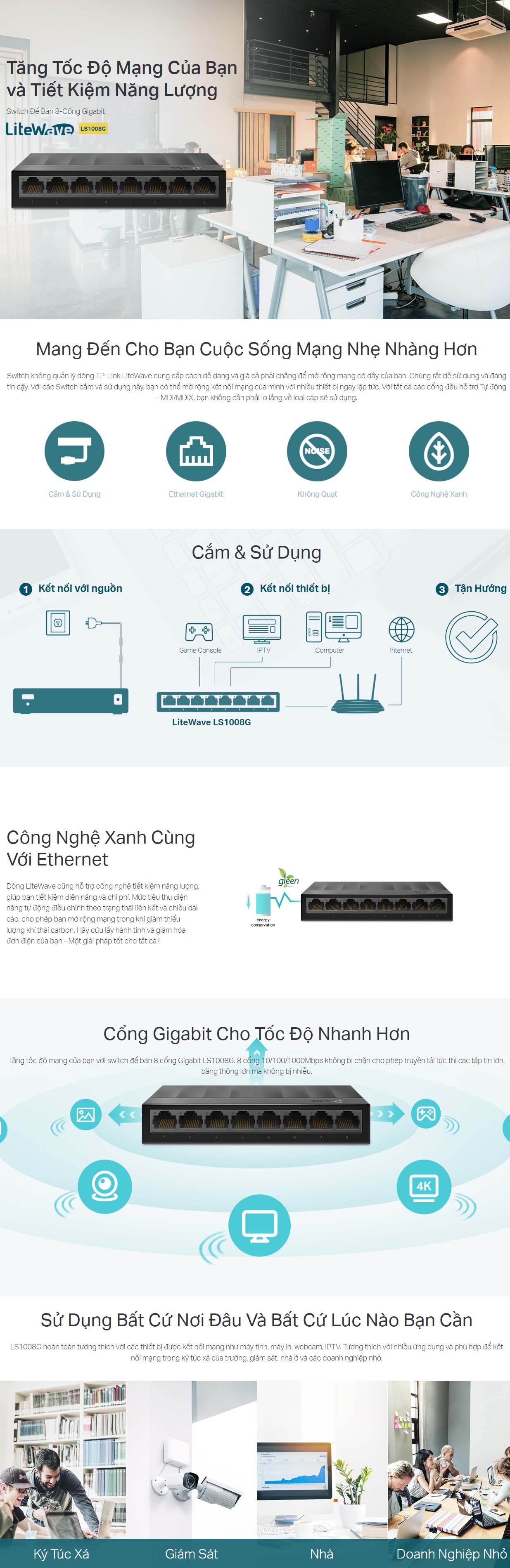 | Giao diện | 8 cổng 10/100/1000Mbps, Auto-Negotiation, Auto-MDI/MDIX |
