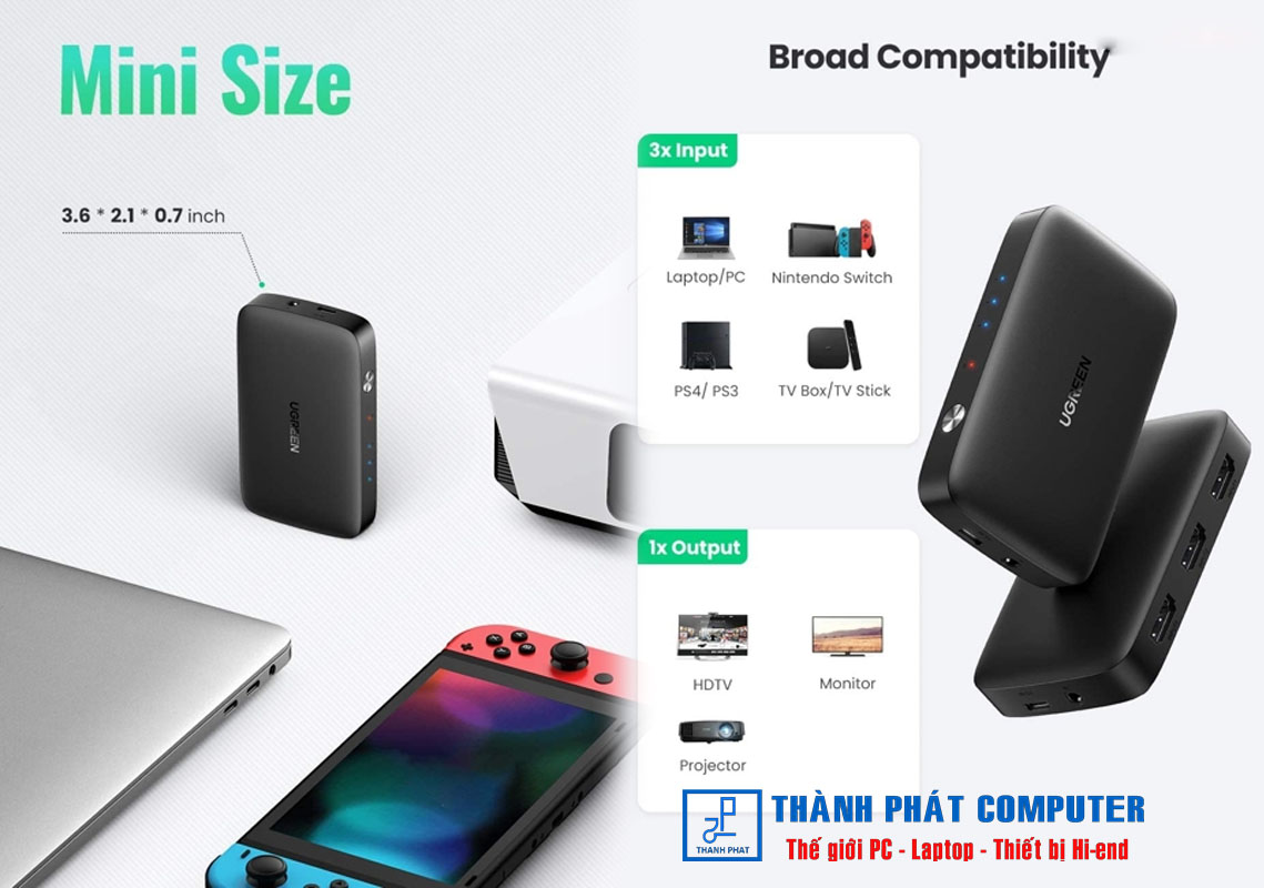 Thiết kế di động và khả năng tương thích rộng: Bộ chuyển HDMI Ugreen có kích thước nhỏ gọn 3,6 * 2,1 * 0,7 inch, tiết kiệm không gian cho bộ trung tâm giải trí của bạn. Tương thích với Roku Stick / Fire Stick, PS4 / PS3, Máy tính xách tay / PC, đầu đĩa Blu-Ray và DVD, Xbox, Nintendo Switch, v.v.